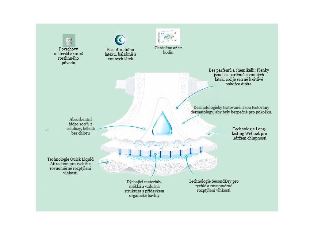 Vnitřní obal pleny je vyroben ze 100% materiálů rostlinného původu, je měkký, prodyšný a jemný k pokožce dítěte. Bez pleťových vod, přírodního latexu a vůní pro přirozenou ochranu pokožky vašeho dítěte. Použití jedinečných technologií SeconDry a Quick Liquid atrakce umožňuje okamžitou a rovnoměrnou absorpci vlhkosti a technologie LongLasting Wetlock zaručuje dlouhodobou savost, která umožňuje udržovat pokožku dítěte v suchu a chrání před podrážděním. ID vlhkosti vám řekne, kdy vyměnit plenku.