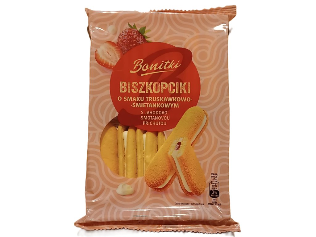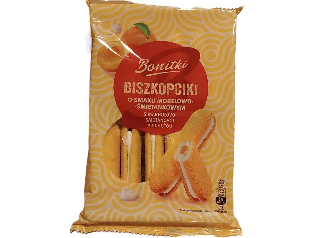 Tyto lehké a nadýchané piškoty o hmotnosti 170 g jsou plněny dvěma vrstvami jemné náplně. Uvnitř najdete sladkou ovocnou náplň , v příchuti meruňka nebo jahoda, doplněnou o jemný, smetanový krém. Piškoty jsou ideální pro rychlé, lehké a ovocné mlsání, skvělé ke kávě, nebo jako oblíbená svačinka.