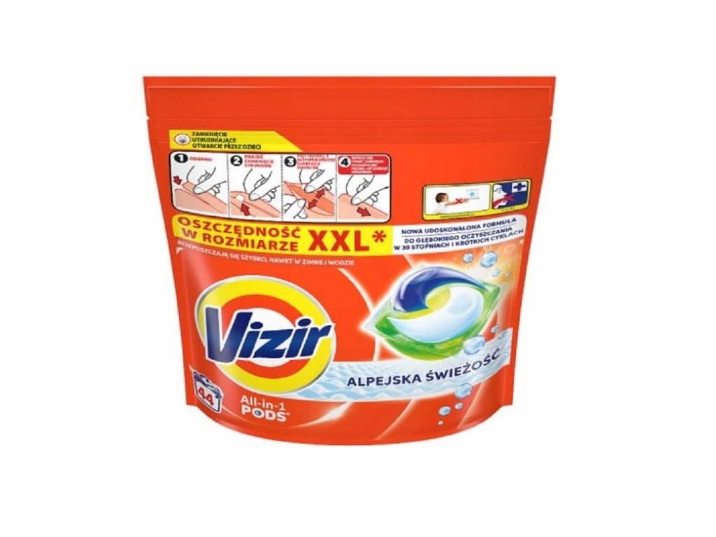 Prací kapsle Vizir All-in-1 PODS v balení 44 kusů představují komplexní řešení praní v jedné předem odměřené dávce. Nabídka zahrnuje varianty buď speciálně určené na barevné prádlo (Color) pro ochranu sytosti, nebo variantu Alpská svěžest (Alpine Fresh), která je obvykle určena pro bílé prádlo a zanechává intenzivní svěží vůni. Obě varianty zajišťují silné odstranění skvrn a jsou účinné i při praní při nízkých teplotách a v krátkých cyklech.